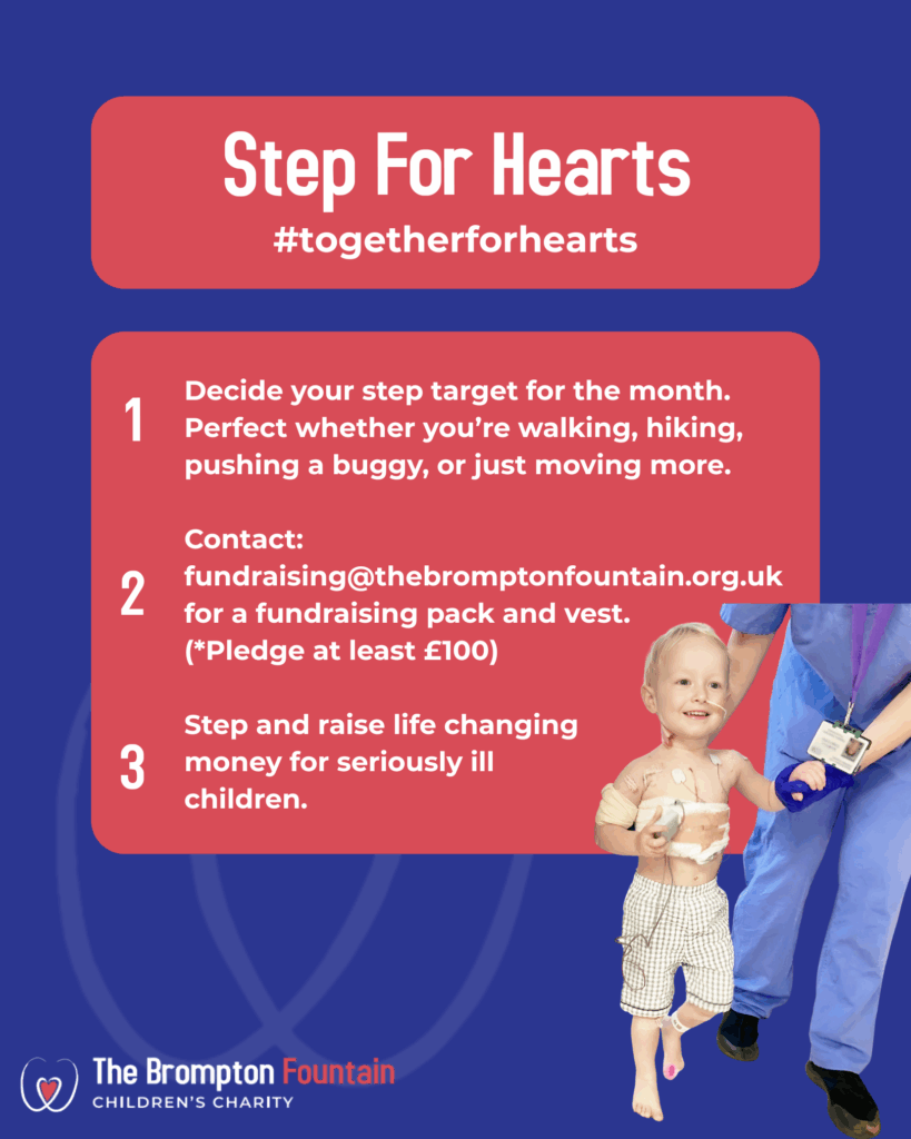 Together For Hearts is The Brompton Fountain’s community fundraising campaign, bringing people together to support children with serious heart conditions. While we are launching during Heart Month in February, fundraising can take place all year round, because the support these children need doesn’t stop at the end of the month.
